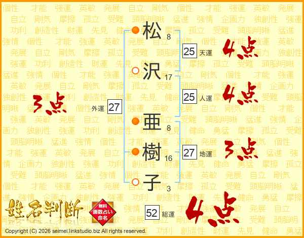松沢亜樹子さんの総運は52画の4点!