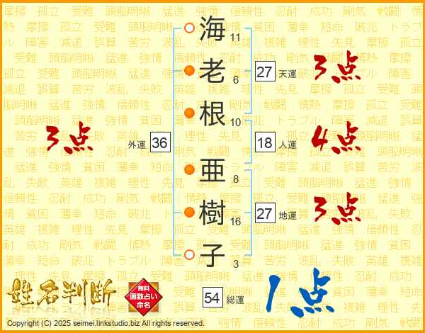 海(11画)老(6画)根(10画) 亜(8画)樹(16画)子(3画)