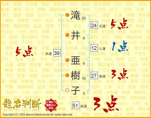 滝(20画)井(4画) 亜(8画)樹(16画)子(3画)