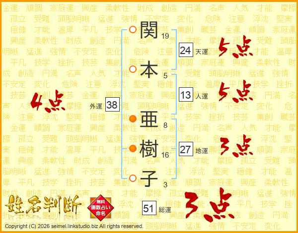 関(19画)本(5画) 亜(8画)樹(16画)子(3画)