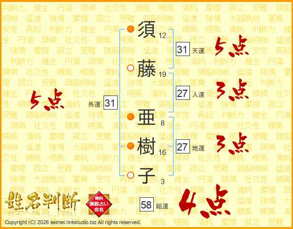 須(12画)藤(19画) 亜(8画)樹(16画)子(3画)