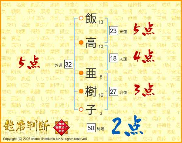 飯(13画)高(10画) 亜(8画)樹(16画)子(3画)
