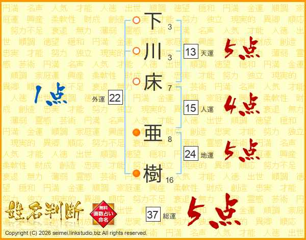 下(3画)川(3画)床(7画) 亜(8画)樹(16画)