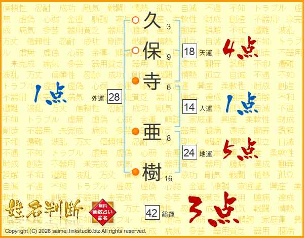 久(3画)保(9画)寺(6画) 亜(8画)樹(16画)