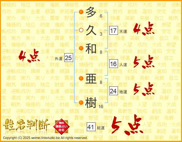 多(6画)久(3画)和(8画) 亜(8画)樹(16画)