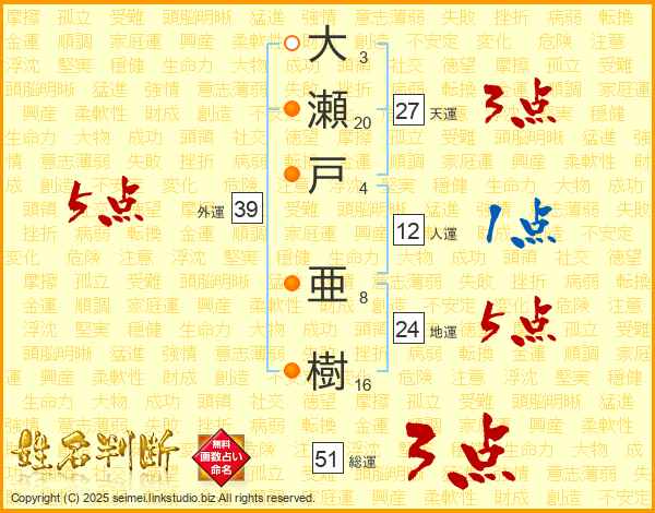 大(3画)瀬(20画)戸(4画) 亜(8画)樹(16画)