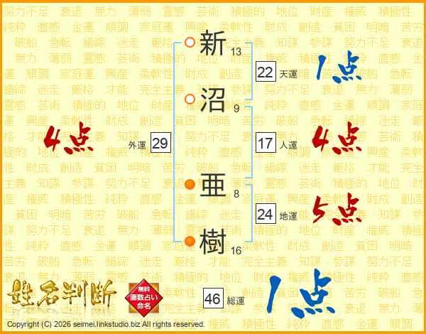 新(13画)沼(9画) 亜(8画)樹(16画)