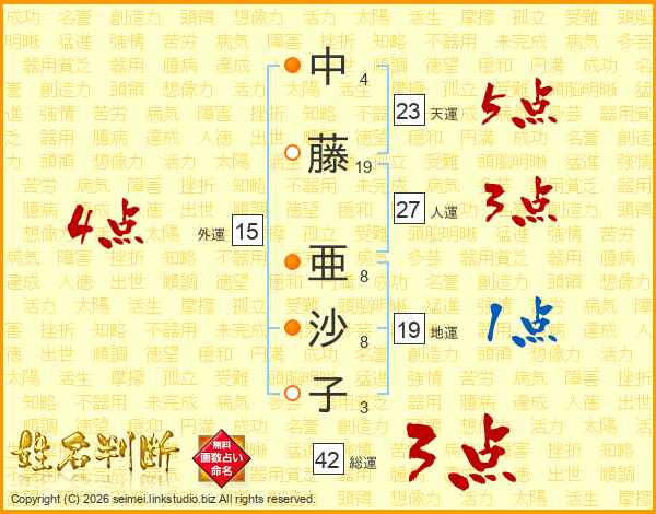 中(4画)藤(19画) 亜(8画)沙(8画)子(3画)
