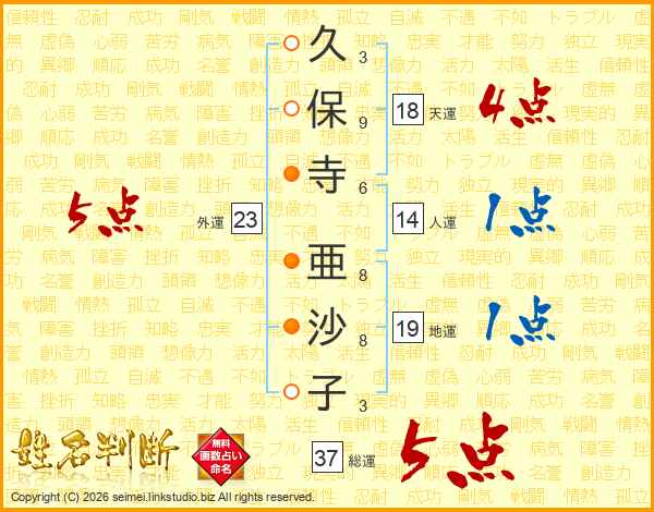 久(3画)保(9画)寺(6画) 亜(8画)沙(8画)子(3画)