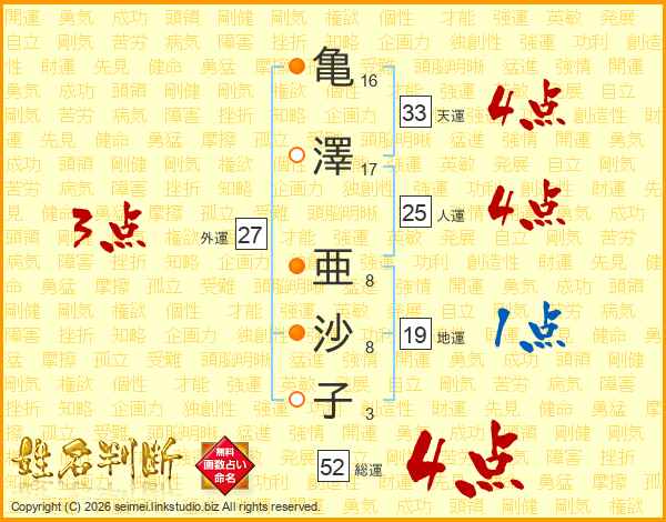 亀(16画)澤(17画) 亜(8画)沙(8画)子(3画)