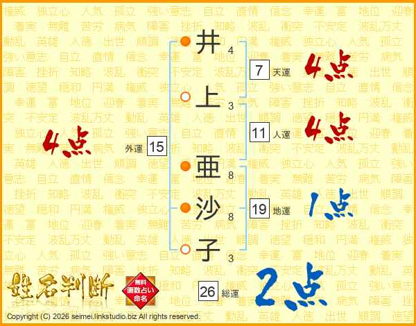 井(4画)上(3画) 亜(8画)沙(8画)子(3画)
