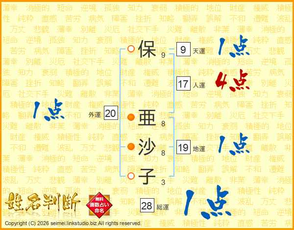 保(9画) 亜(8画)沙(8画)子(3画)