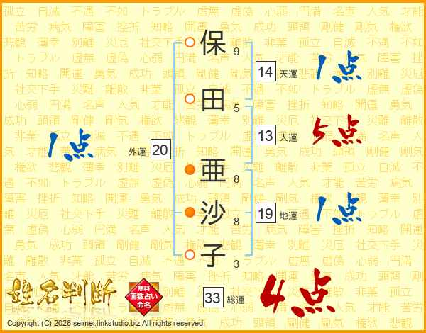 保田亜沙子さんの総運は33画の4点!