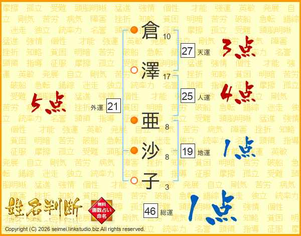 倉澤亜沙子さんの天運は27画の3点!