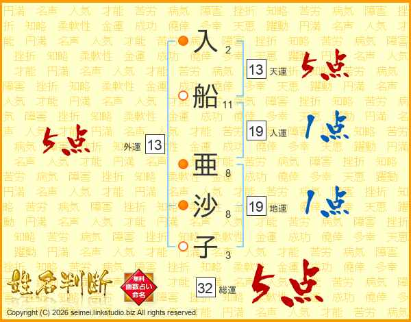 入(2画)船(11画) 亜(8画)沙(8画)子(3画)