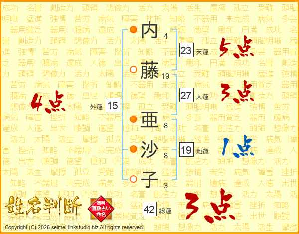 内(4画)藤(19画) 亜(8画)沙(8画)子(3画)
