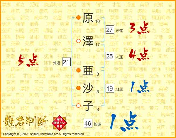 原(10画)澤(17画) 亜(8画)沙(8画)子(3画)
