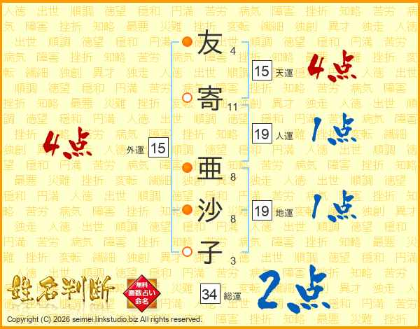 友(4画)寄(11画) 亜(8画)沙(8画)子(3画)