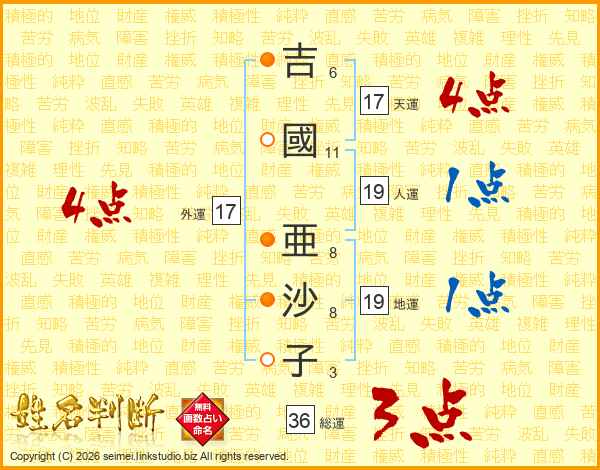 吉(6画)國(11画) 亜(8画)沙(8画)子(3画)