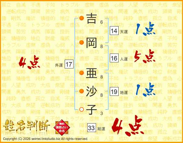 吉(6画)岡(8画) 亜(8画)沙(8画)子(3画)