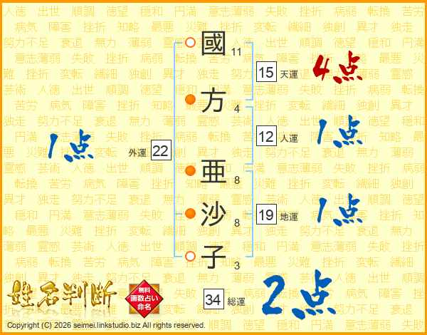 國(11画)方(4画) 亜(8画)沙(8画)子(3画)