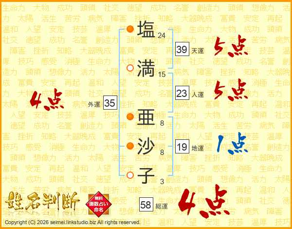 塩(24画)満(15画) 亜(8画)沙(8画)子(3画)
