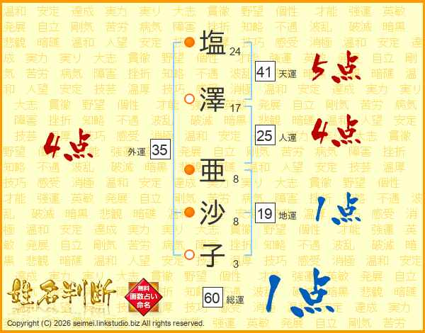 塩澤亜沙子さんの天運は41画の5点!
