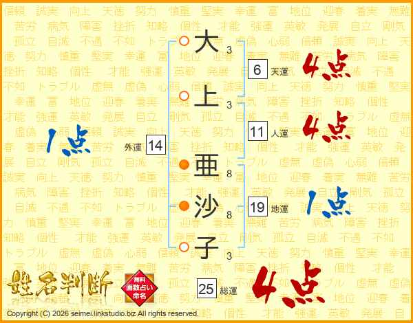 大(3画)上(3画) 亜(8画)沙(8画)子(3画)
