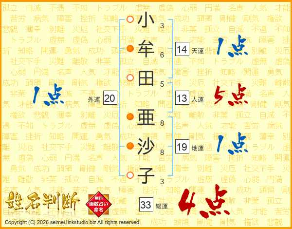 小(3画)牟(6画)田(5画) 亜(8画)沙(8画)子(3画)