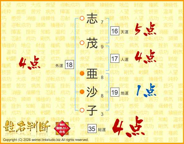 志(7画)茂(9画) 亜(8画)沙(8画)子(3画)