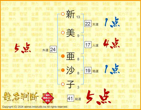 新(13画)美(9画) 亜(8画)沙(8画)子(3画)