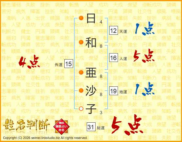 日(4画)和(8画) 亜(8画)沙(8画)子(3画)