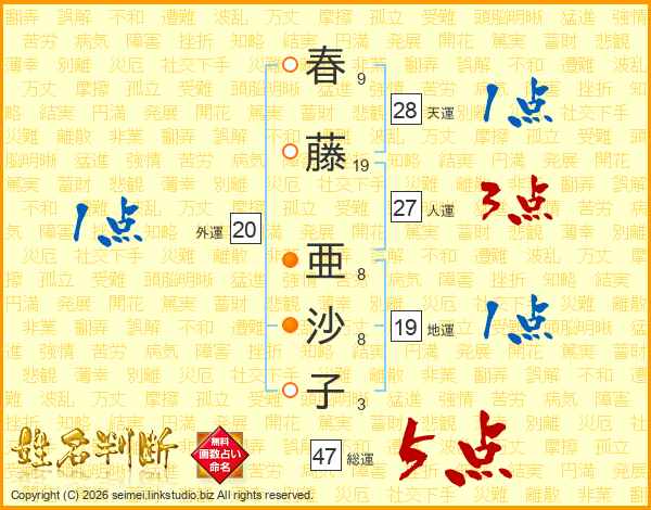 春藤亜沙子さんの総運は47画の5点!