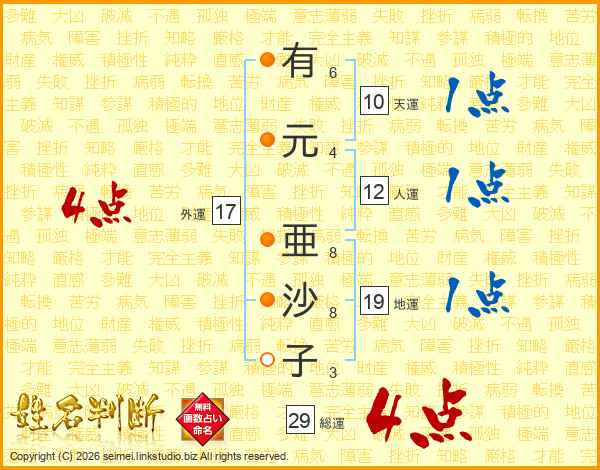 有(6画)元(4画) 亜(8画)沙(8画)子(3画)
