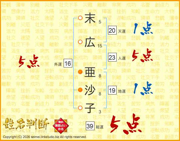 末(5画)広(15画) 亜(8画)沙(8画)子(3画)