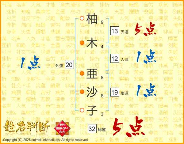 柚木亜沙子さんの総運は32画の5点!