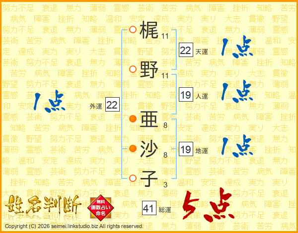 梶(11画)野(11画) 亜(8画)沙(8画)子(3画)