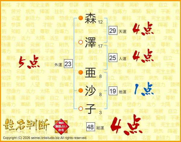 森(12画)澤(17画) 亜(8画)沙(8画)子(3画)