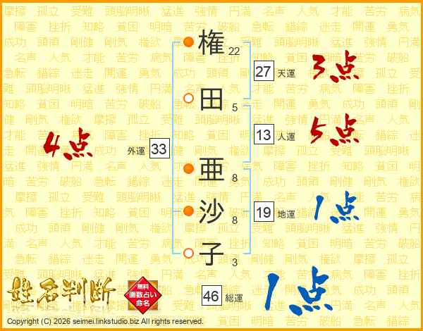 権(22画)田(5画) 亜(8画)沙(8画)子(3画)