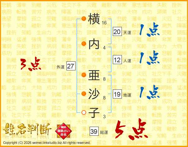 横内亜沙子さんの総運は39画の5点!