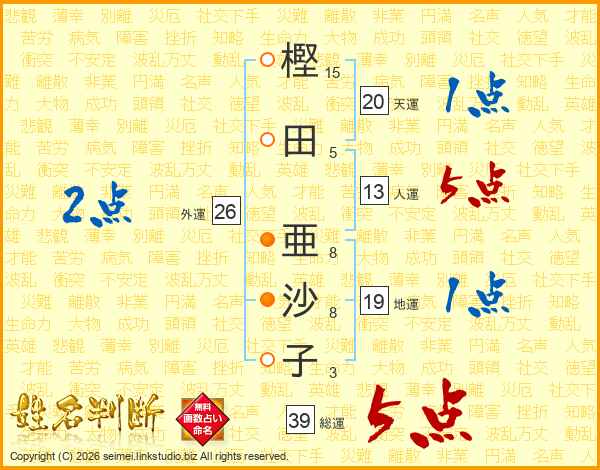 樫田亜沙子さんの総運は39画の5点!