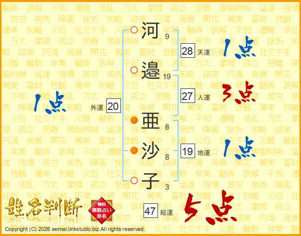 河(9画)邉(19画) 亜(8画)沙(8画)子(3画)