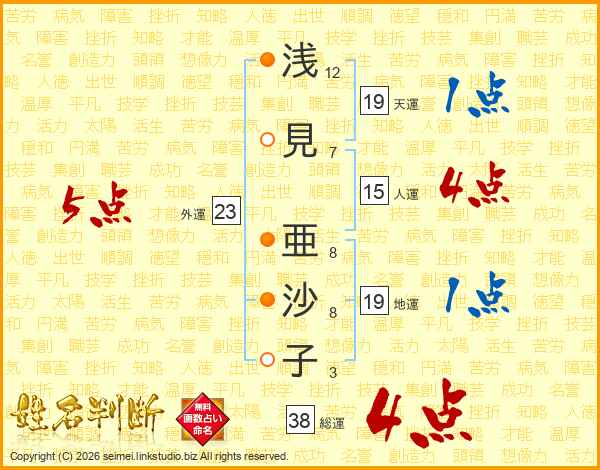 浅見亜沙子さんの総運は38画の4点!