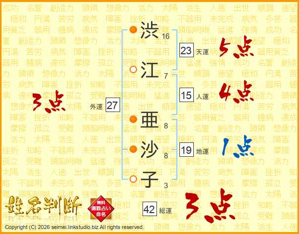 渋(16画)江(7画) 亜(8画)沙(8画)子(3画)