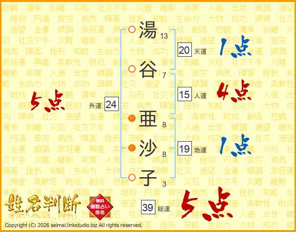 湯(13画)谷(7画) 亜(8画)沙(8画)子(3画)