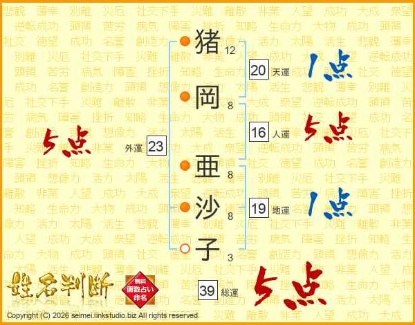 猪(12画)岡(8画) 亜(8画)沙(8画)子(3画)