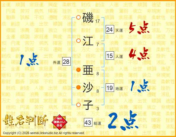 磯(17画)江(7画) 亜(8画)沙(8画)子(3画)