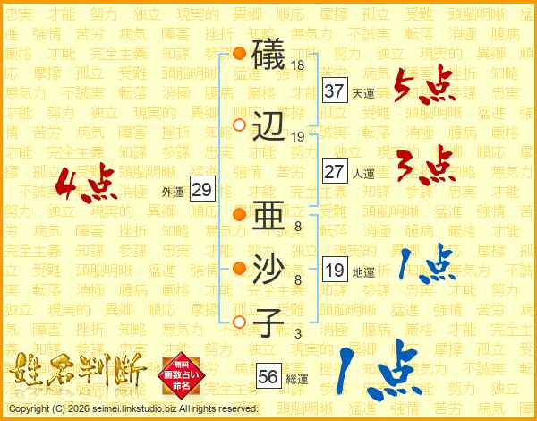 礒(18画)辺(19画) 亜(8画)沙(8画)子(3画)