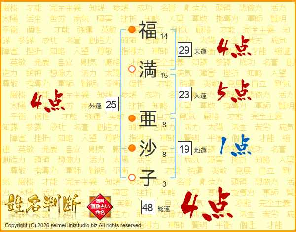 福(14画)満(15画) 亜(8画)沙(8画)子(3画)