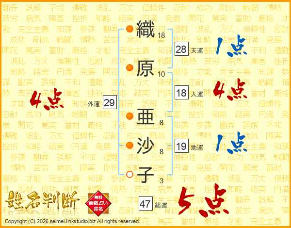 織(18画)原(10画) 亜(8画)沙(8画)子(3画)
